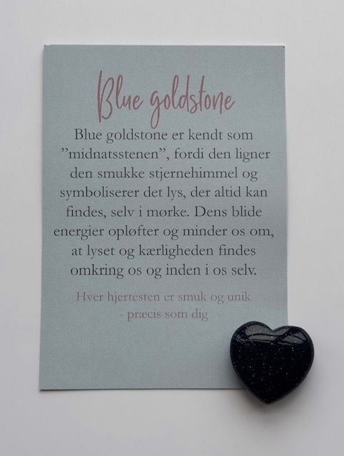 Hjertesten i blue goldstone med A7-kort – lys, håb og trøst