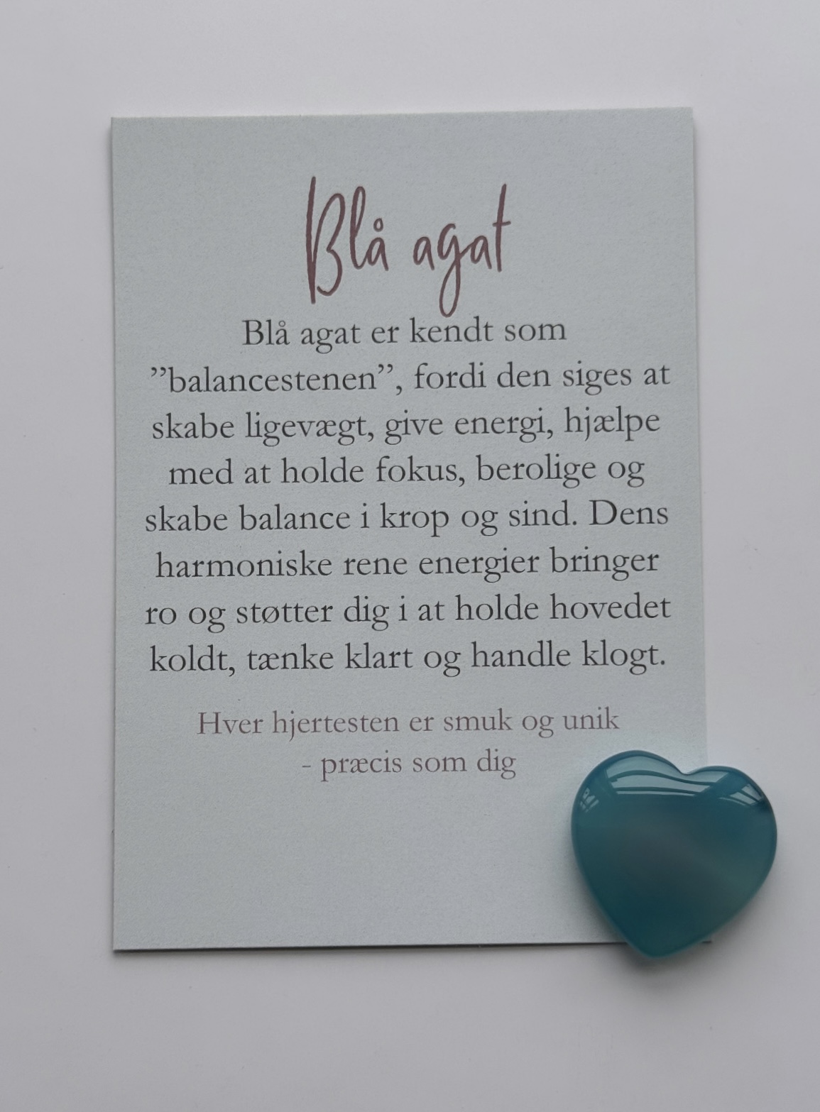 Hver sten er unik og kan variere i farve, spil og overflade – præcis som det menneske, den er tiltænkt. Hjertestenen leveres med et A7-kort, der beskriver stenens egenskaber og symbolik.