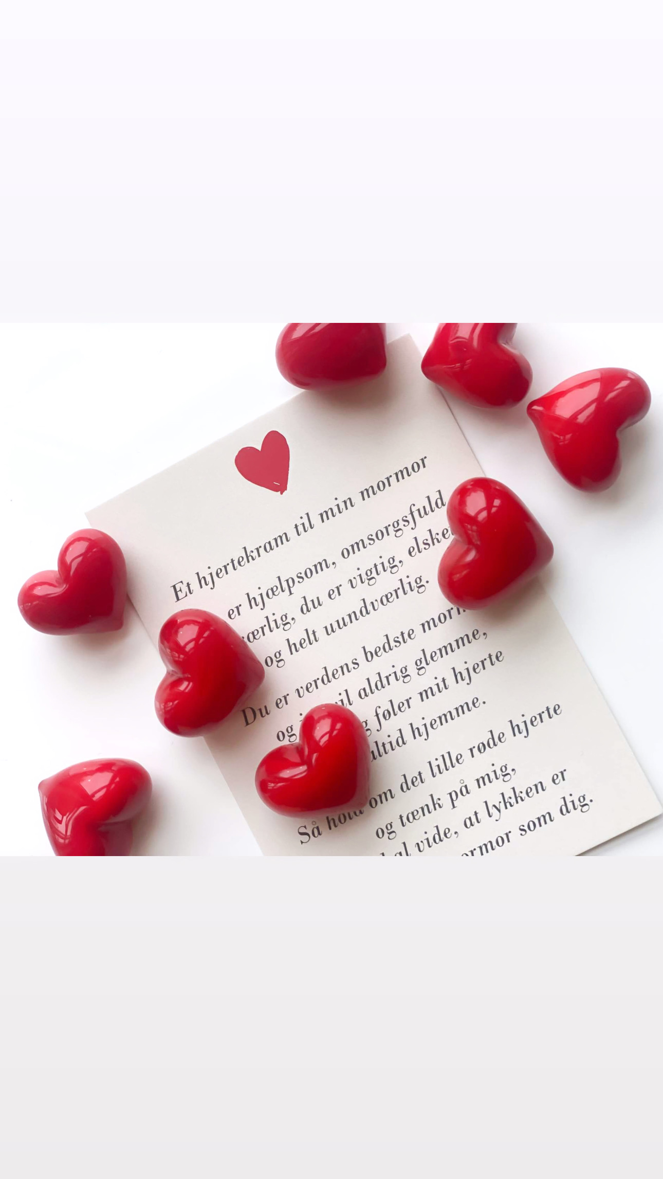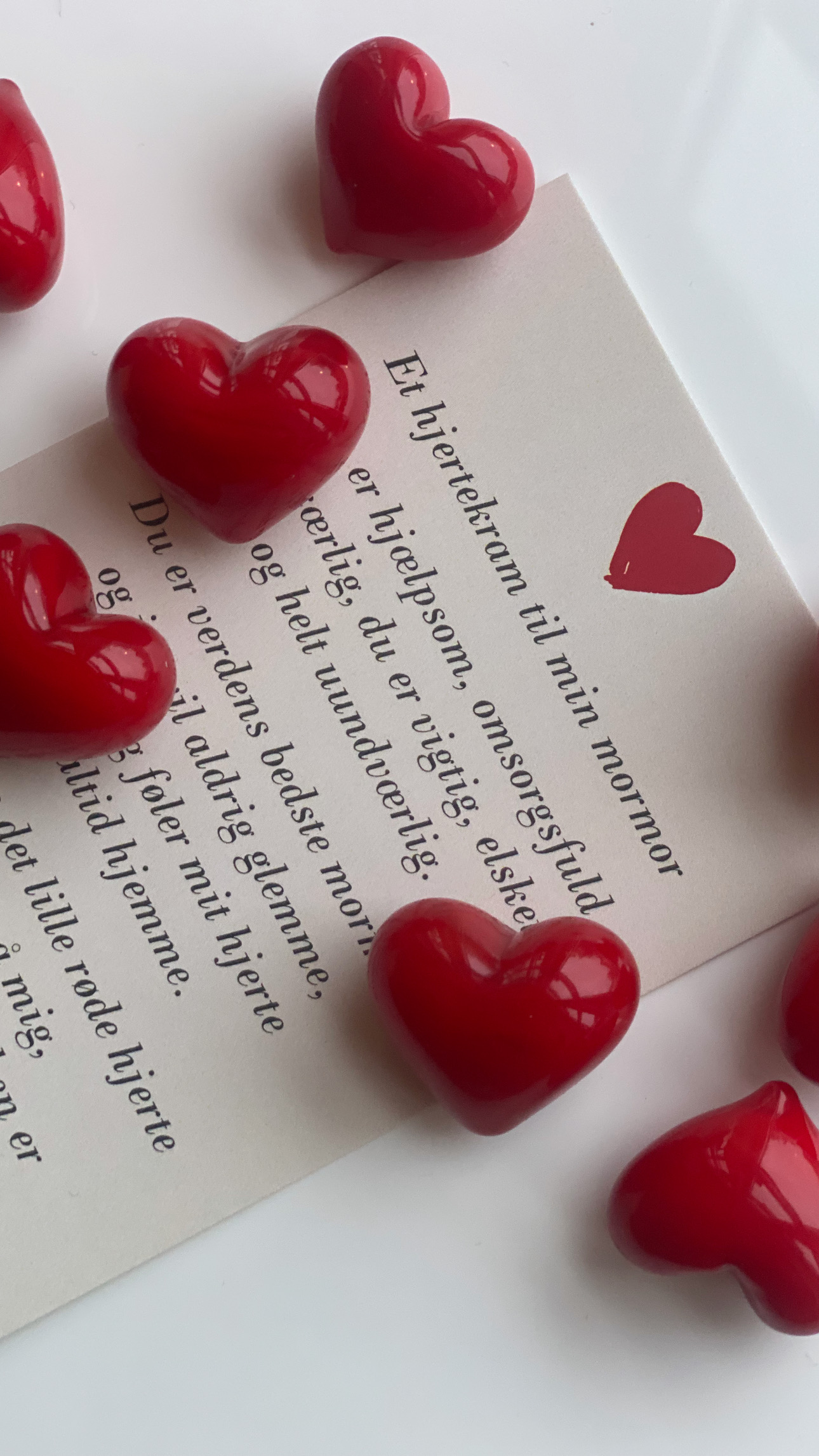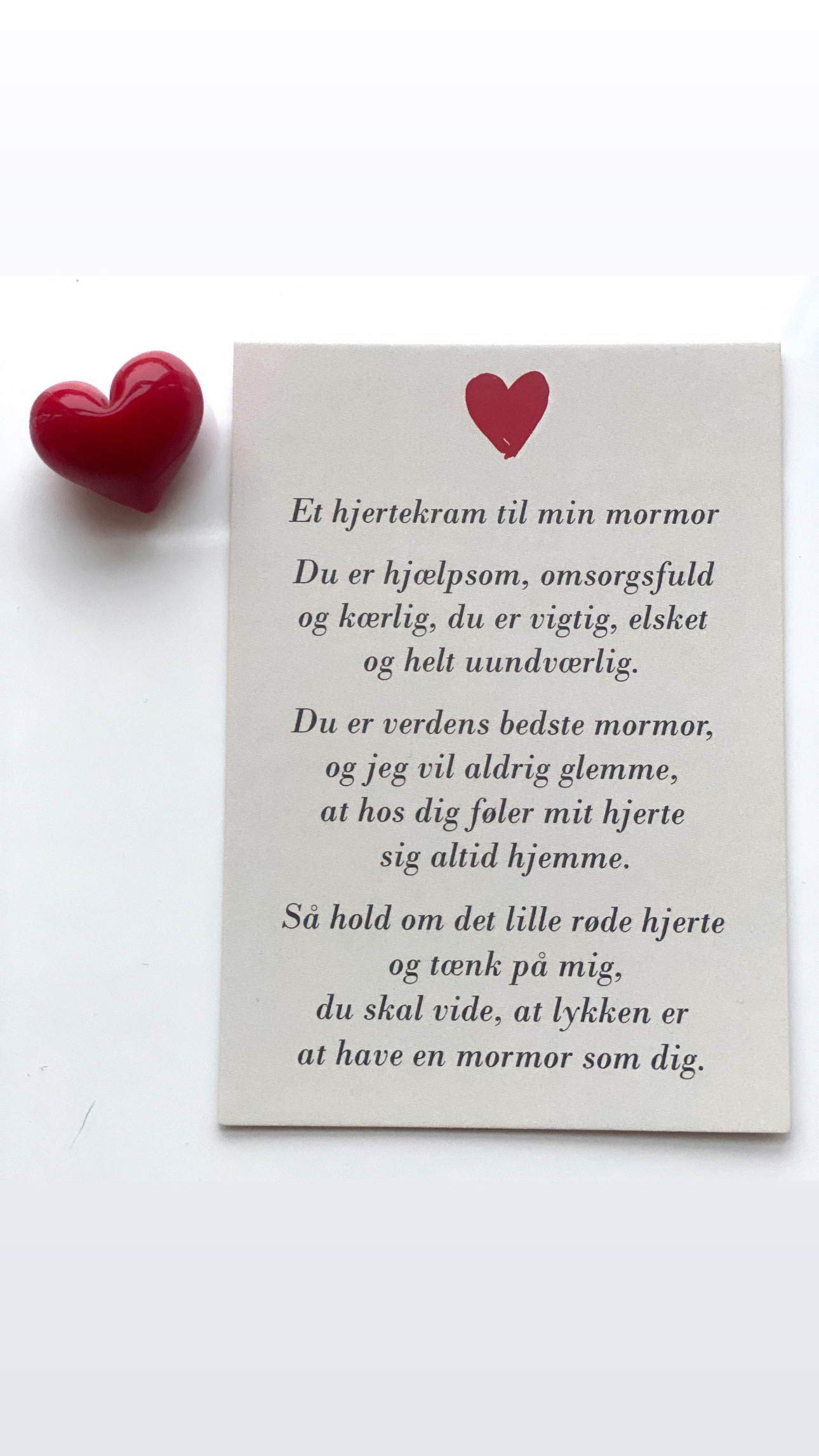 Du modtager et lille rødt robust glashjerte og et kort med teksten om et hjertekram til min mormor