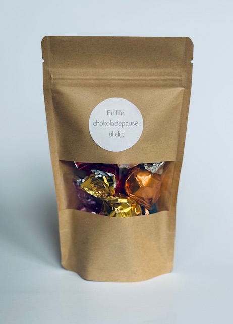 Hver Chokohilsen indeholder seks lækre chokolader i blandede varianter, pakket enkelt og pænt i naturbrun pose med genluk og den valgte hilsen på forsiden.