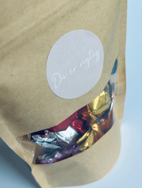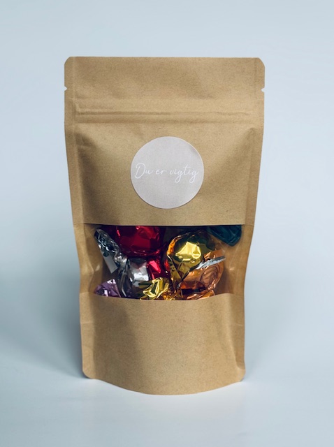Hver Chokohilsen indeholder seks lækre chokolader i blandede varianter, pakket enkelt og pænt i naturbrun pose med genluk og den valgte hilsen på forsiden.