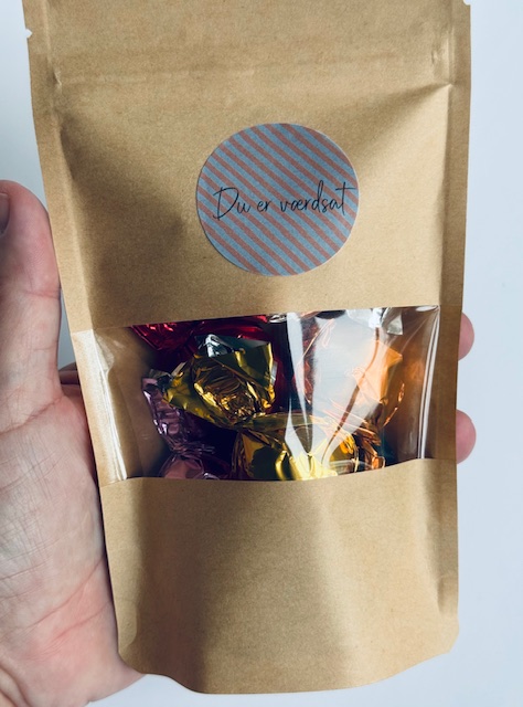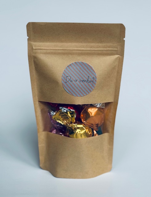 Hver Chokohilsen indeholder seks lækre chokolader i blandede varianter, pakket enkelt og pænt i naturbrun pose med genluk og den valgte hilsen på forsiden.
