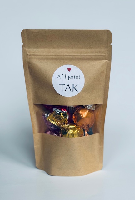 Hver Chokohilsen indeholder seks lækre chokolader i blandede varianter, pakket enkelt og pænt i naturbrun pose med genluk og den valgte hilsen på forsiden.