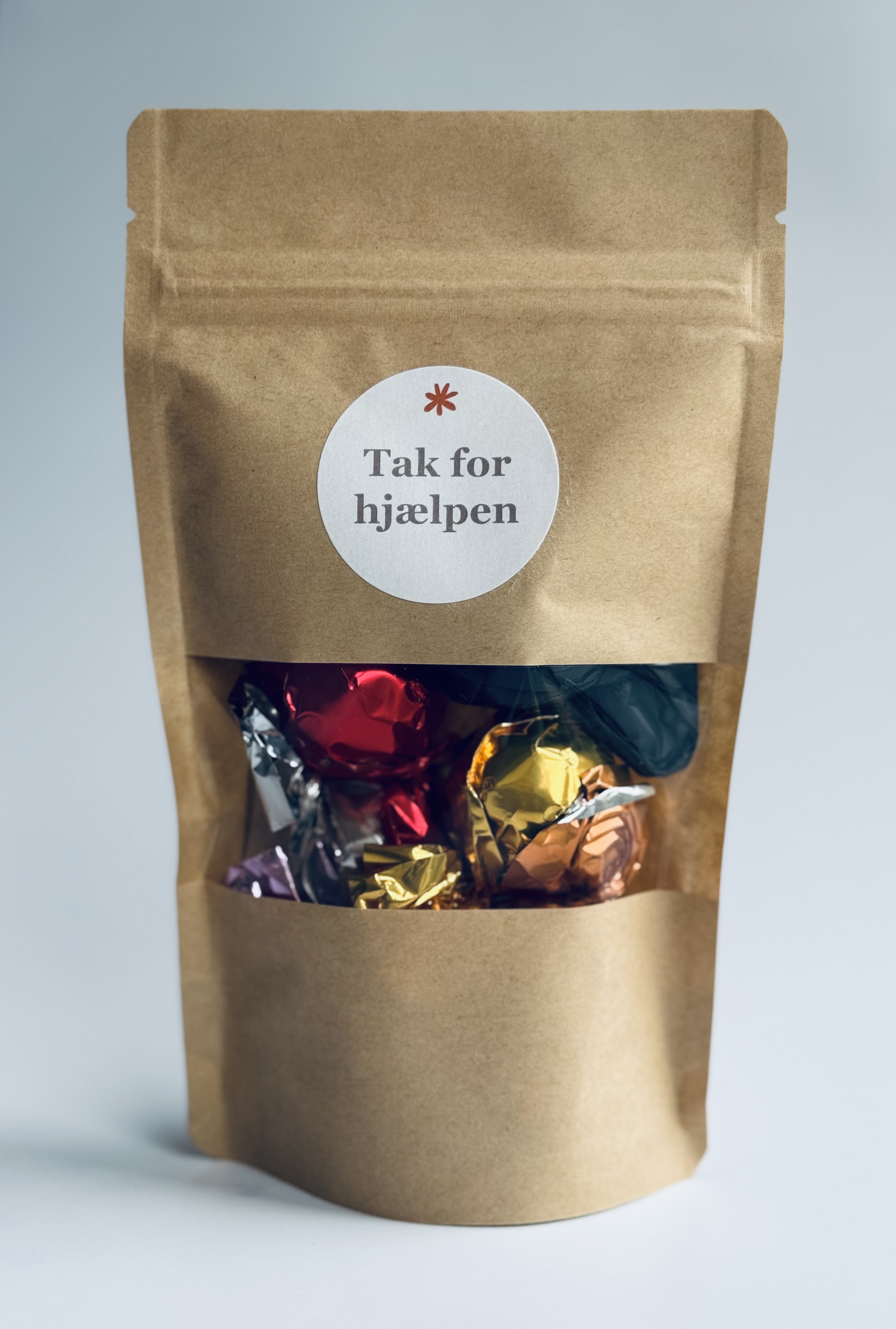 Hver Chokohilsen indeholder seks lækre chokolader i blandede varianter, pakket enkelt og pænt i naturbrun pose med genluk og den valgte hilsen på forsiden.
