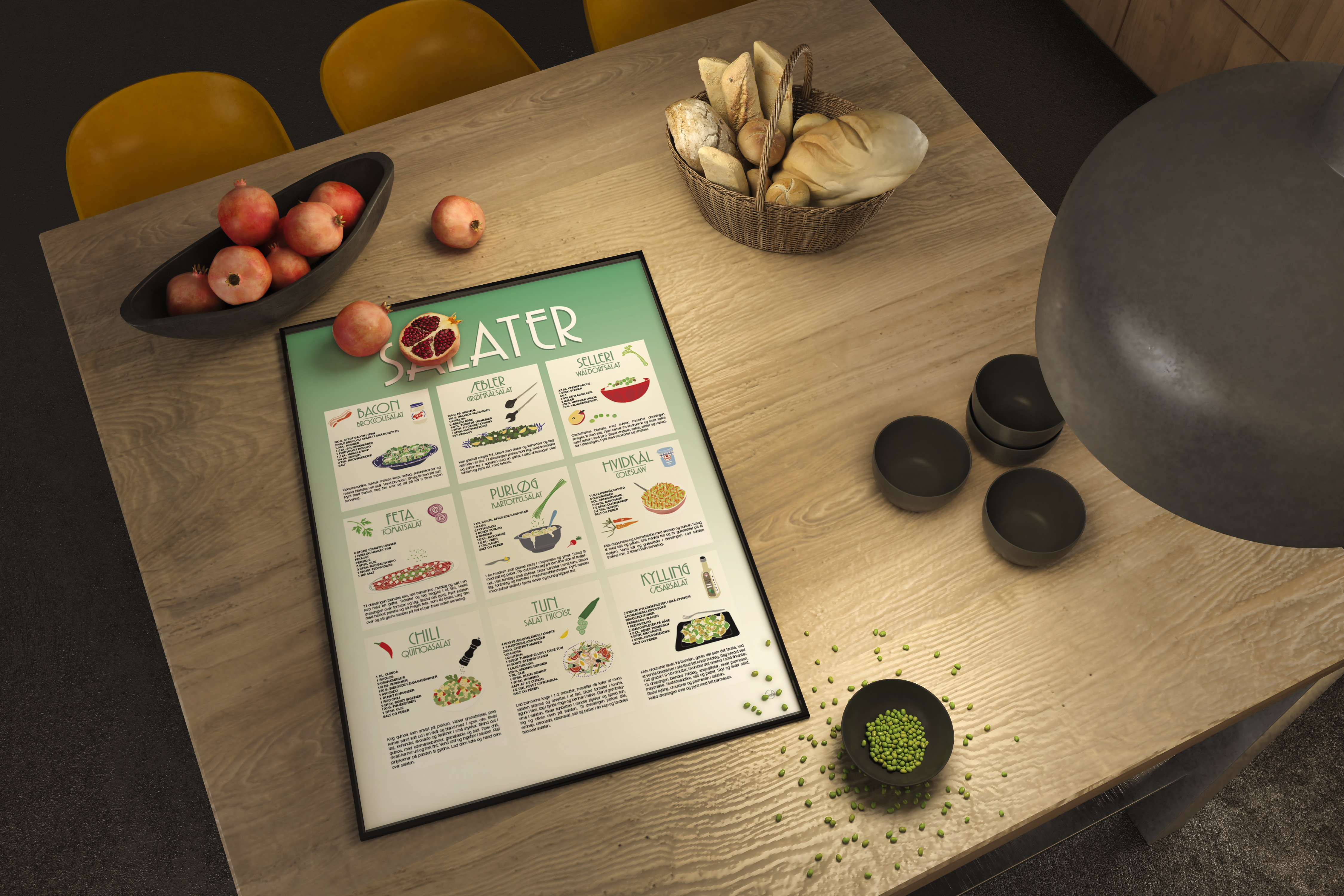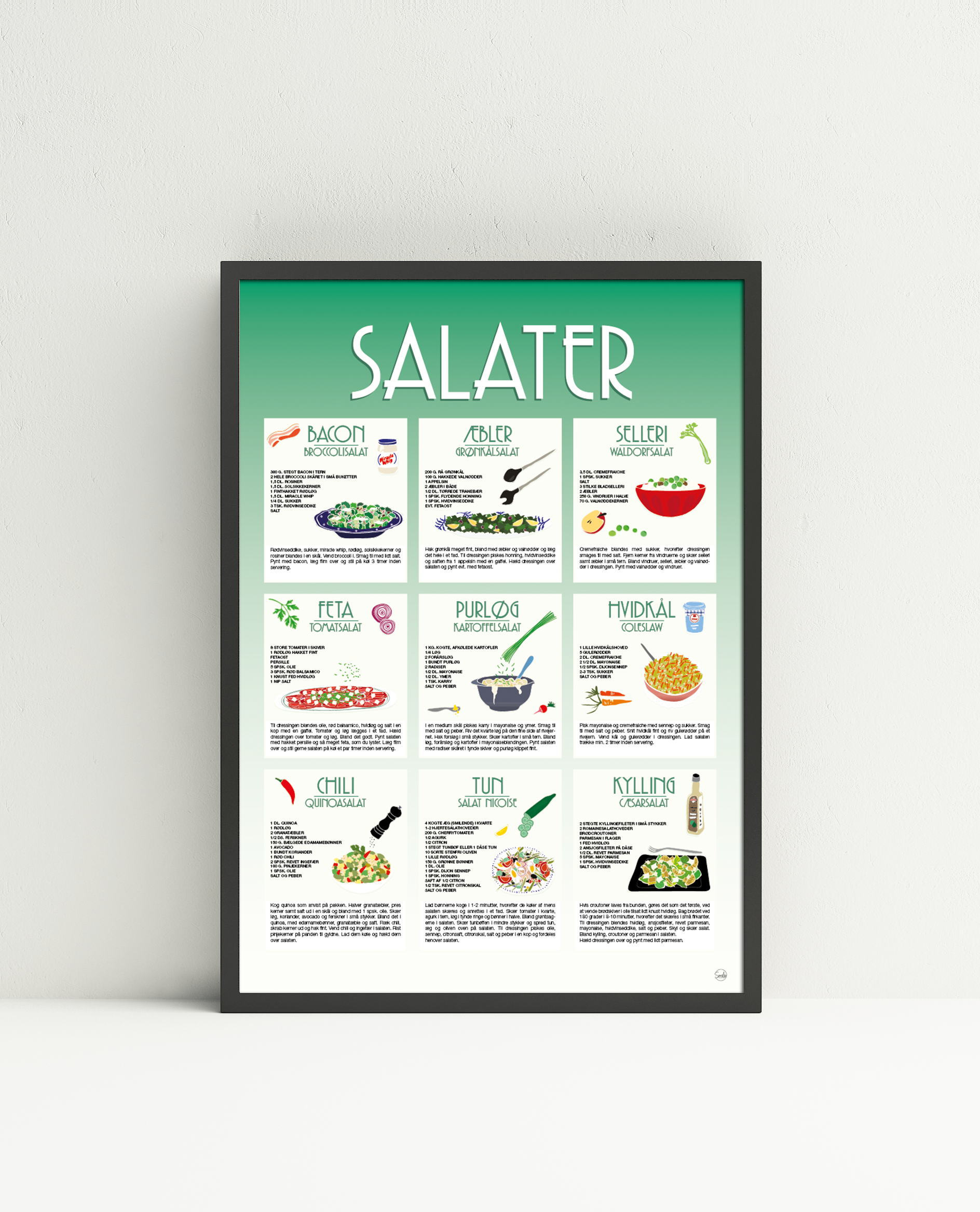 Løft stemningen i dit køkken med denne smukke opskriftsplakat fyldt med 9 nemme og velsmagende salater.