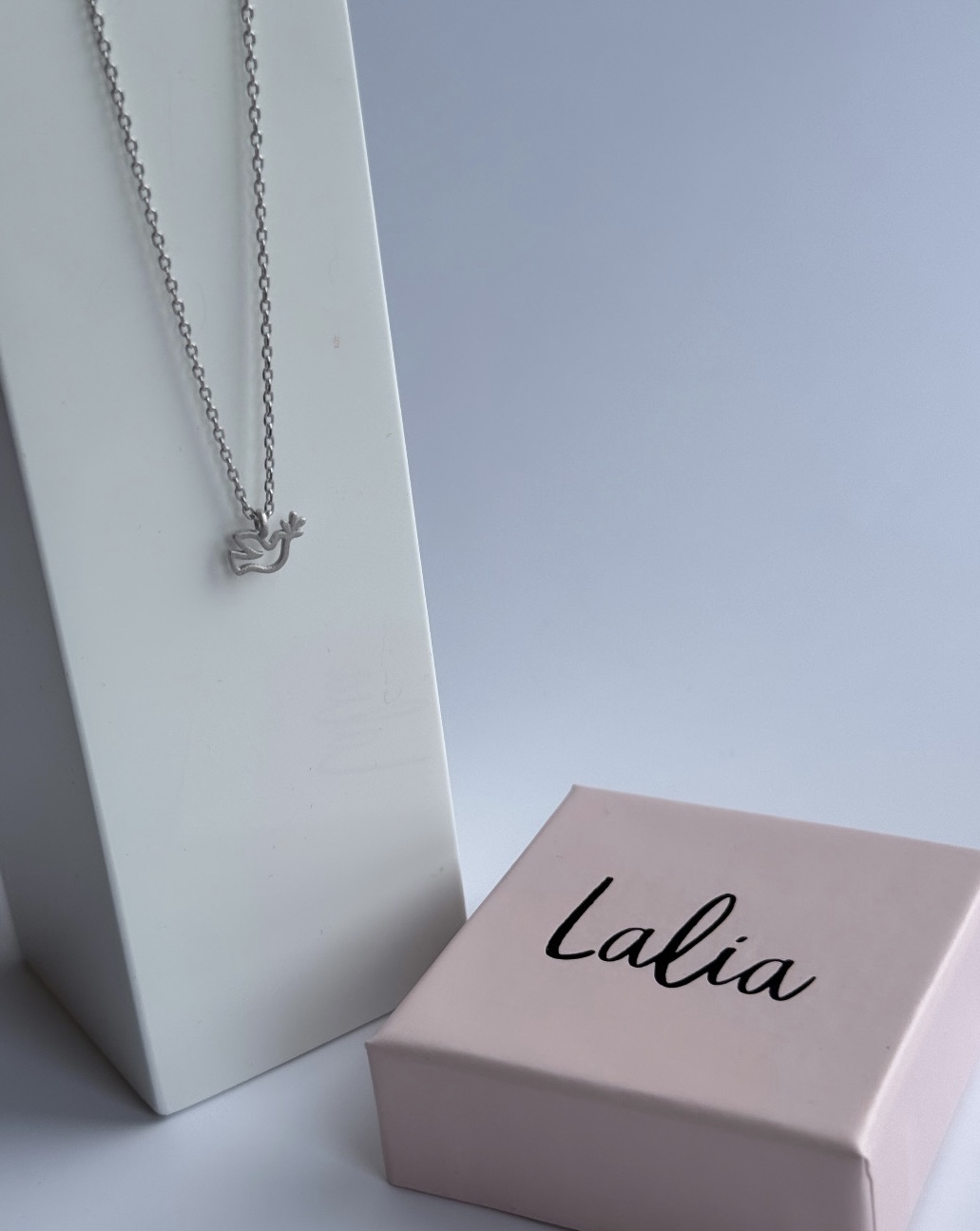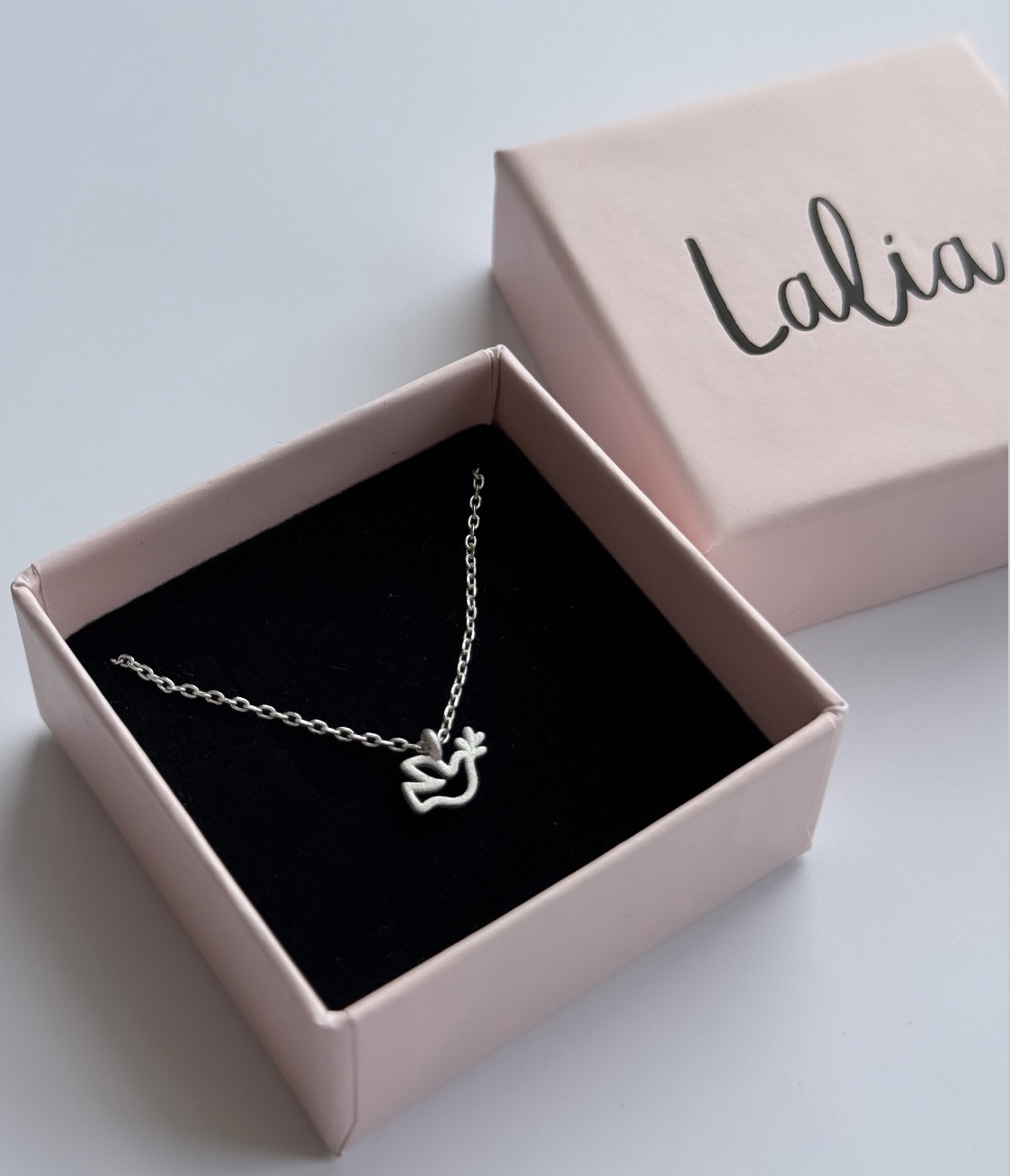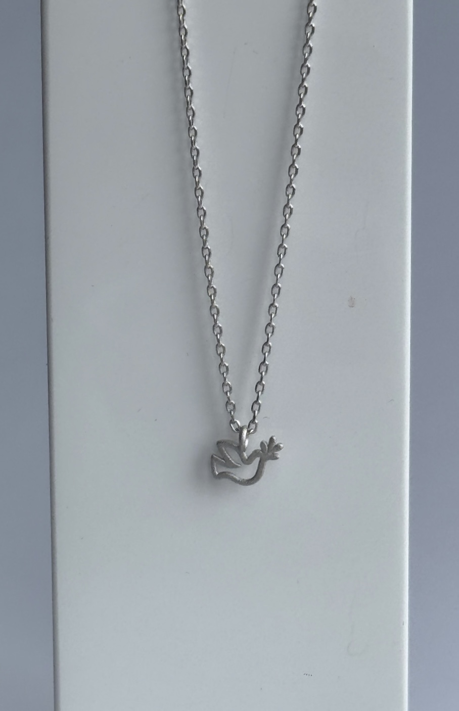 Fredsdue halskæde i forsølvet messing, med et vedhæng i mat forsølvet messing designet som en lille fredsdue på 6 × 8 mm.