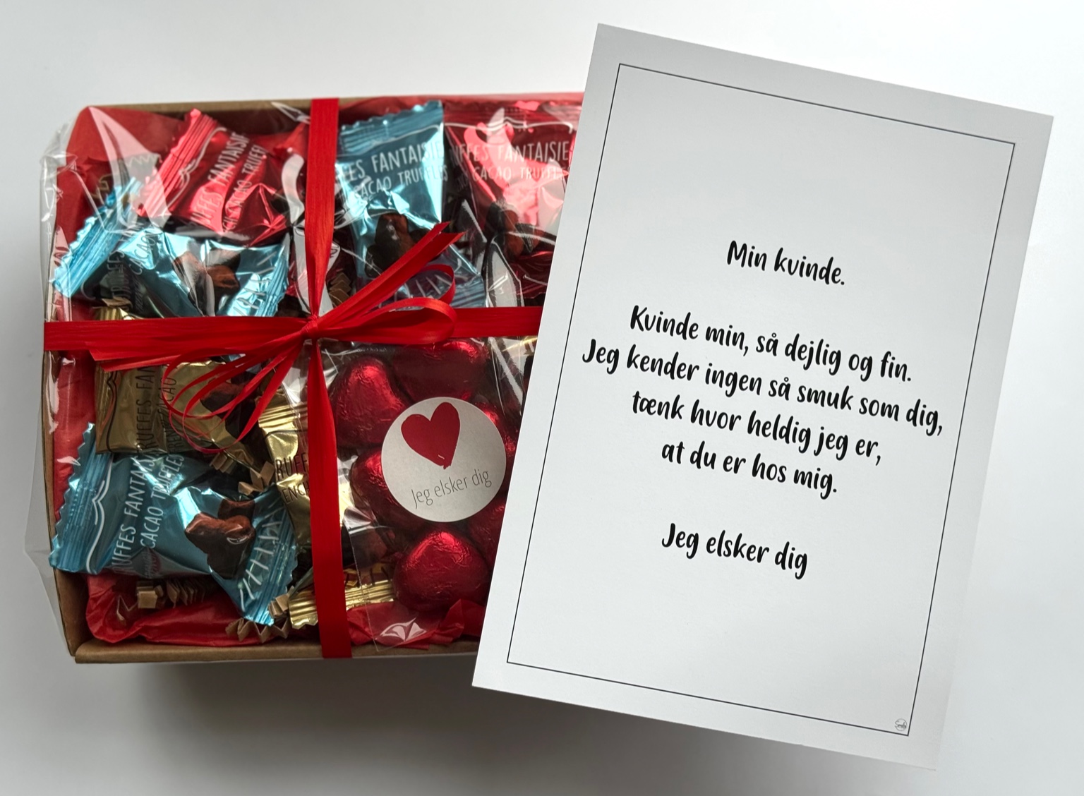 Min kvinde | Valentinskurv med chokolade og A5 kort (Færdigpakket gavekurv)