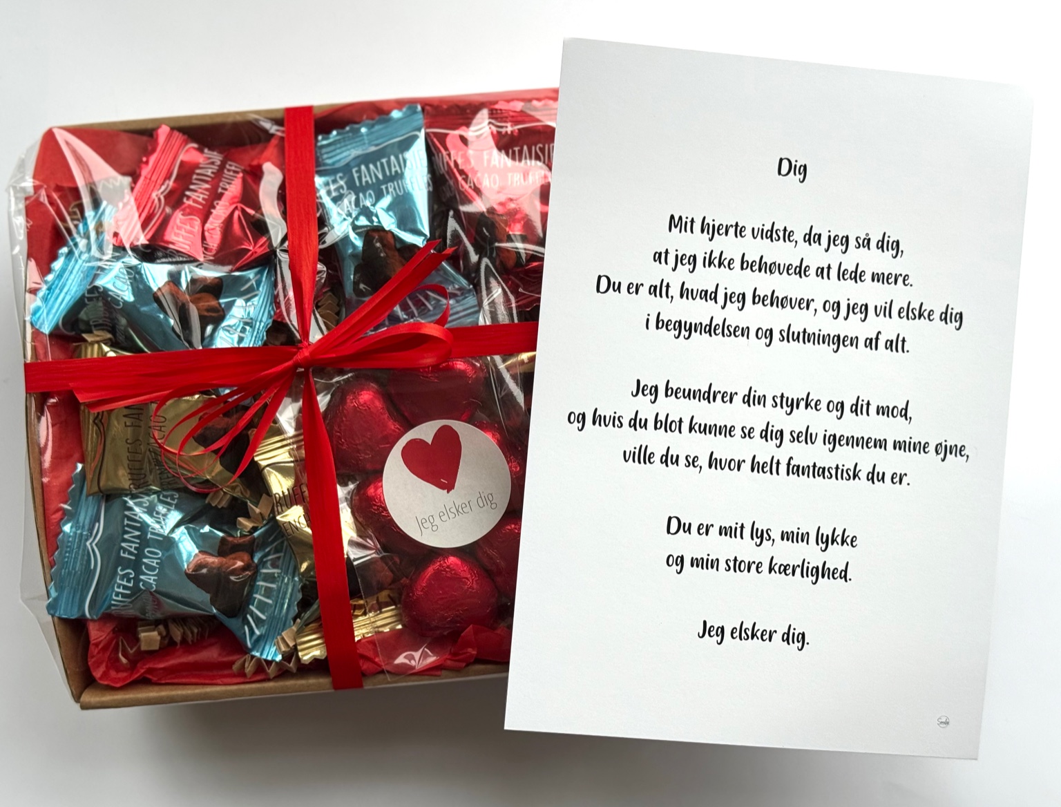 Dig. Jeg elsker dig | Valentinskurv med chokolade og A5 kort (Færdigpakket gavekurv)