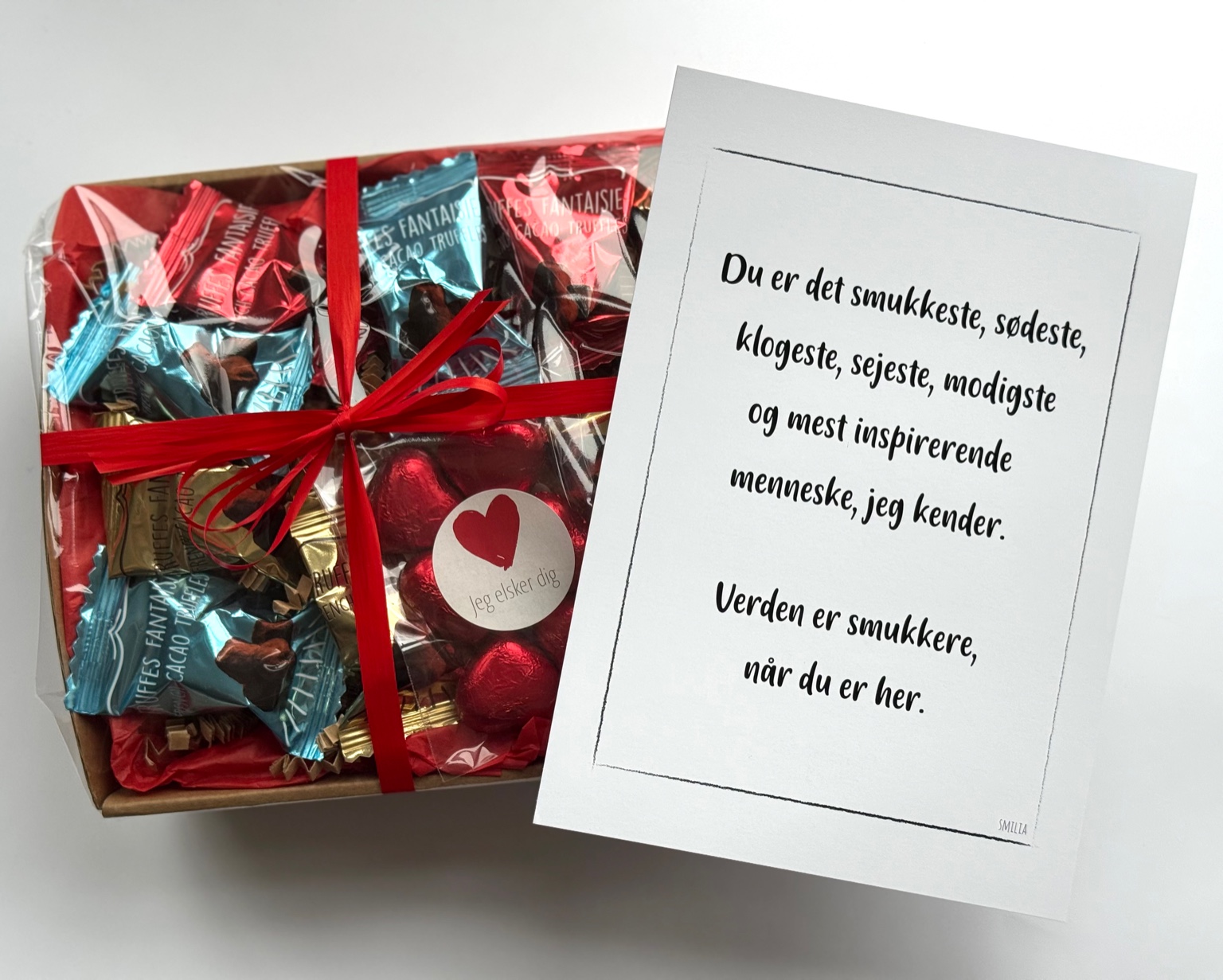 Du er det smukkeste | Valentinskurv med chokolade og A5 kort (Færdigpakket gavekurv)