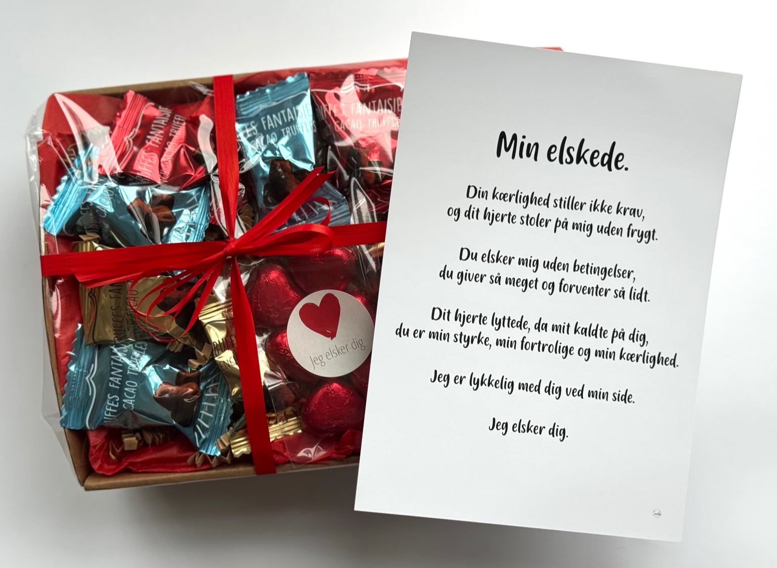 Min elskede | Valentinskurv med chokolade og A5 kort (Færdigpakket gavekurv)