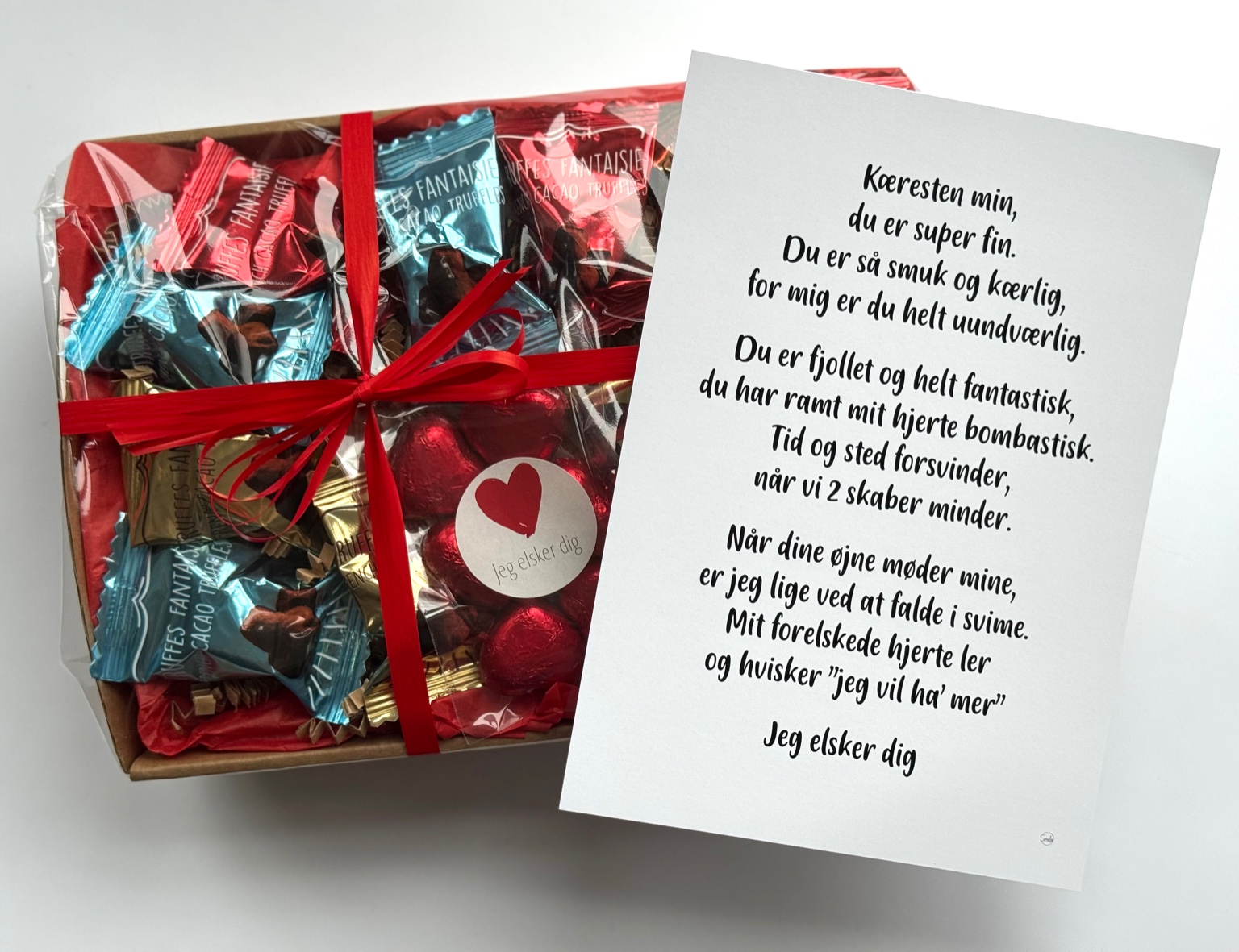 Kæresten min | Valentinskurv med chokolade og A5 kort (Færdigpakket gavekurv)
