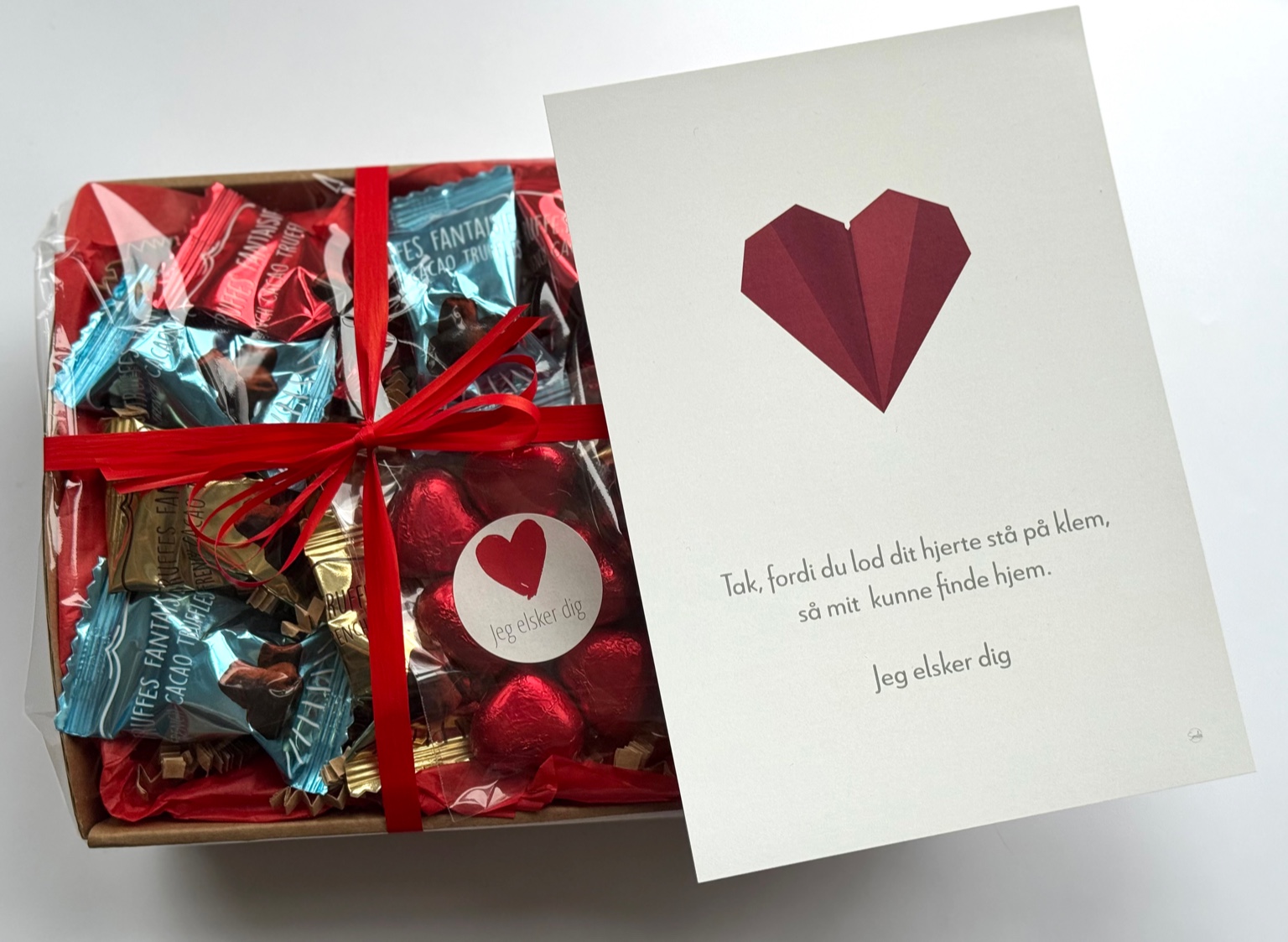 Tak, fordi du lod dit hjerte stå på klem | Valentinskurv med chokolade og A5 kort (Færdigpakket gavekurv)