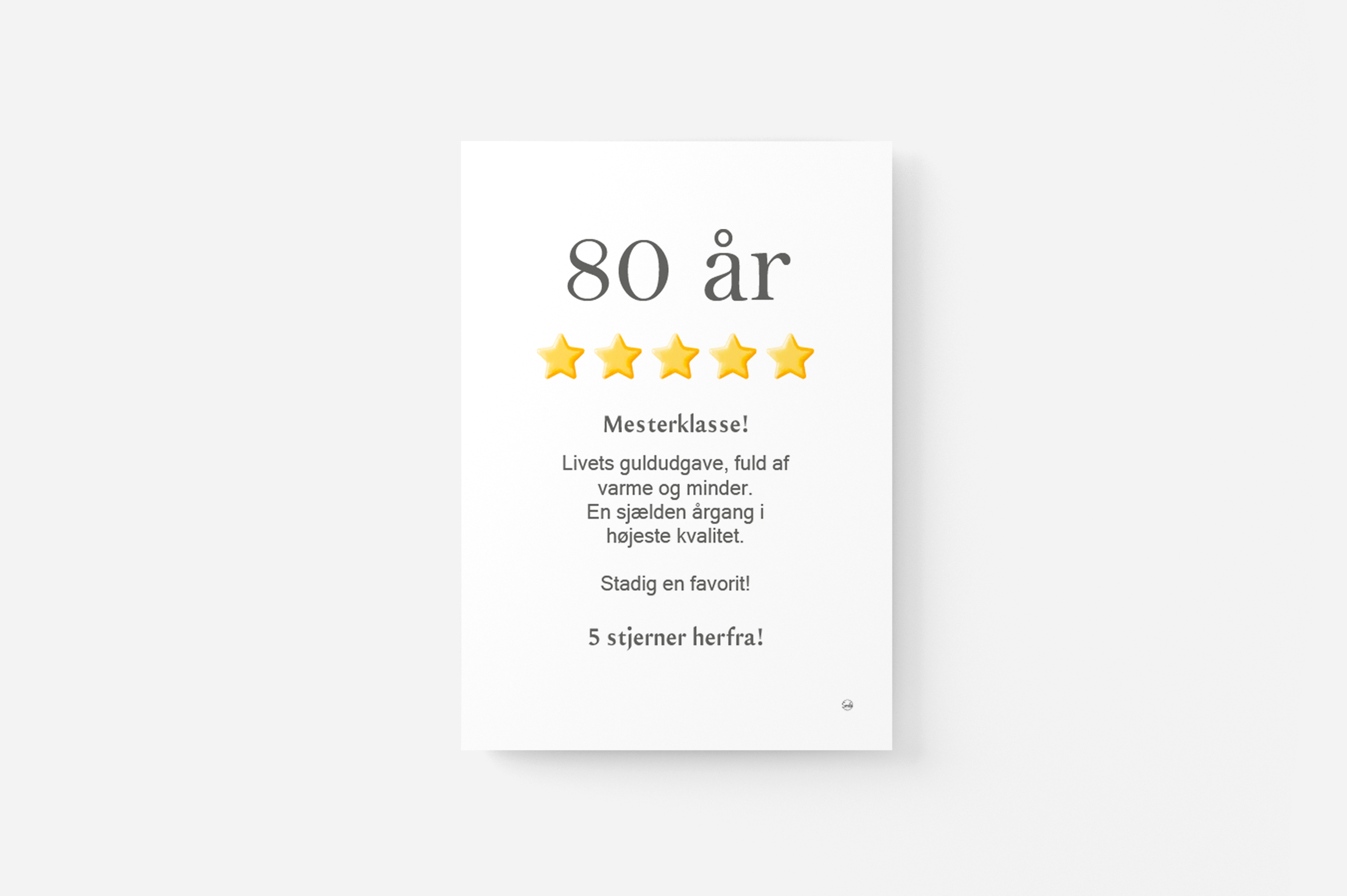 Vores 5-stjerners kort er designet som små anmeldelser af livets milepæle – til de runde fødselsdage, fødselaren og jubilæet.